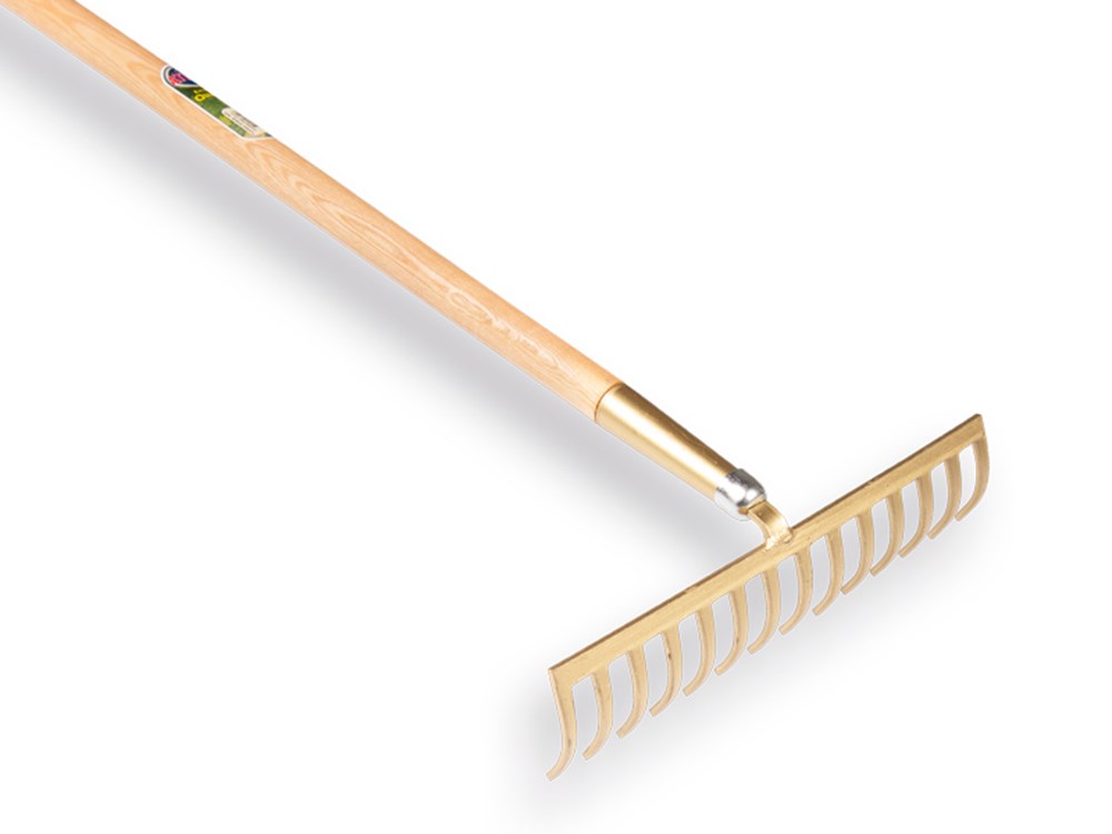 Tuinhark ATLAS met 14 gebogen tanden. Gehard stalen hark compleet met gelakte Essen steel 170 x 2,8 cm. Deze hark met gebogen tanden is ideaal voor het maken van een zaaibed, het egaliseren/onkruid vrij houden van grindpaden en het fijn maken en egaliseren van grond. De stevige lange gelakte steel voelt prettig aan en is eenvoudig schoon te maken. Merk Atlas, OFFNER.