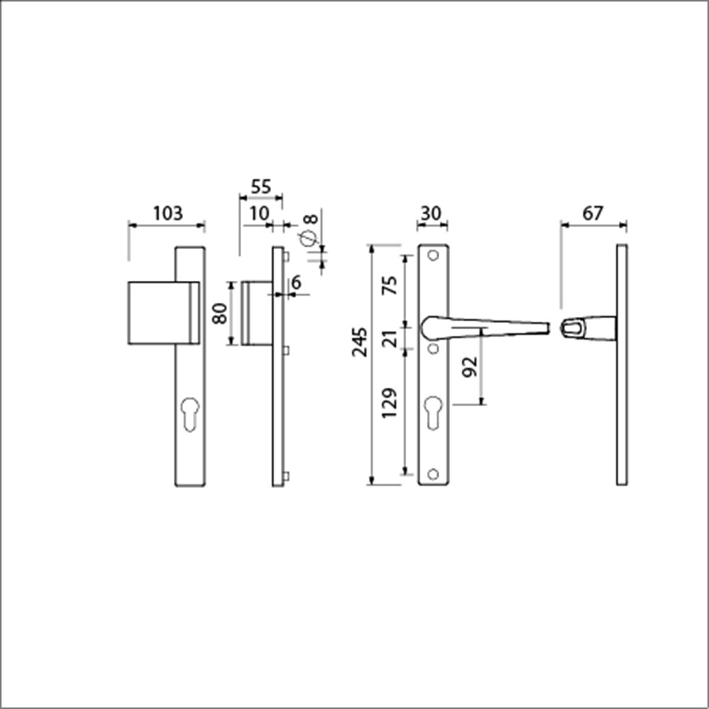 deurkruk 357 vastdraaibaar , vierkantstift 8 mm en 3 schroeven M5x70 RVS tbv. deurdikte 53/57 mm.