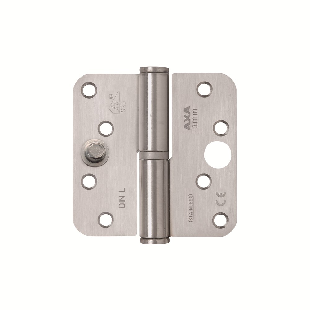 Solide, lichtlopende, inbraakwerende roestvaststalen AXA veiligheids kogelstiftpaumelle met een hoog draagvermogen en ronde hoeken.