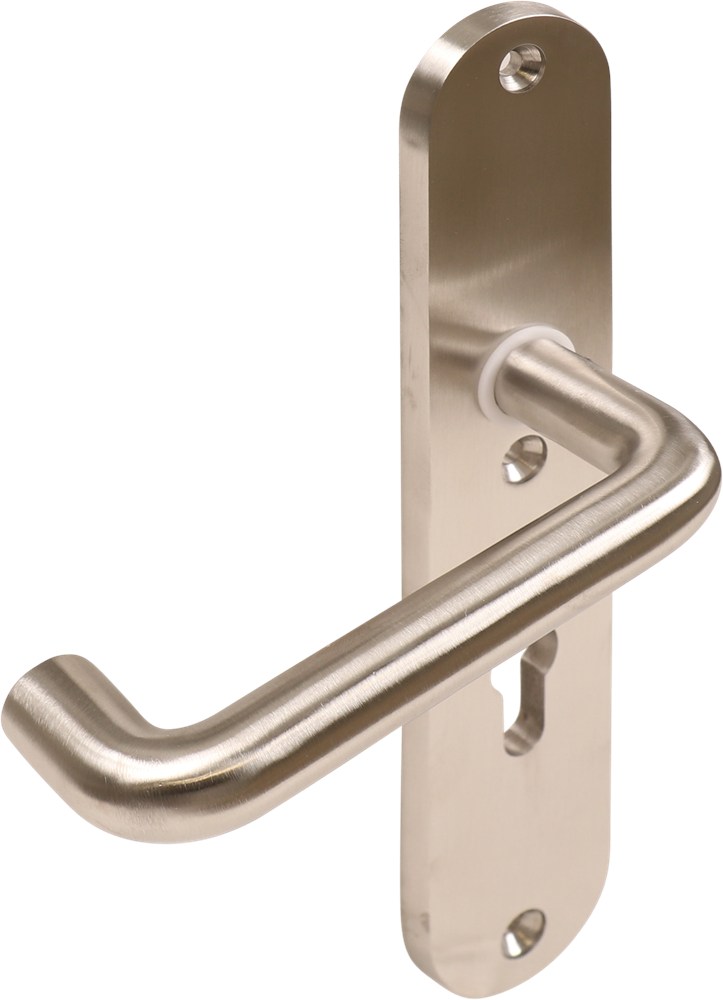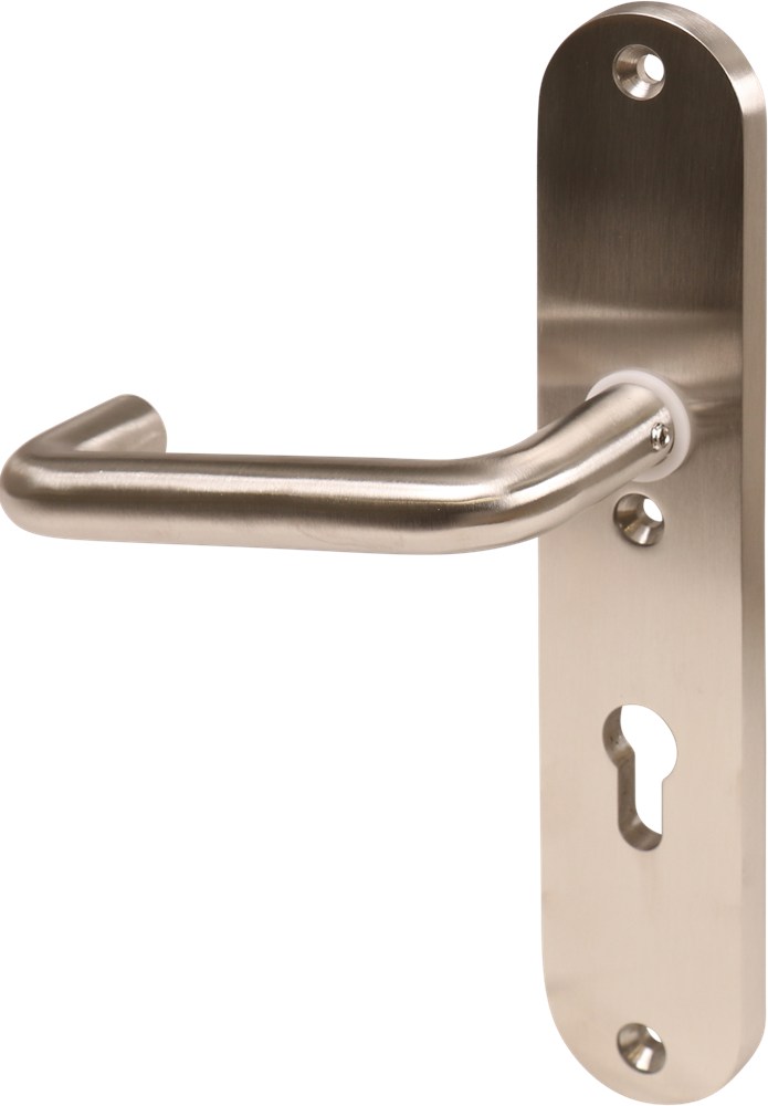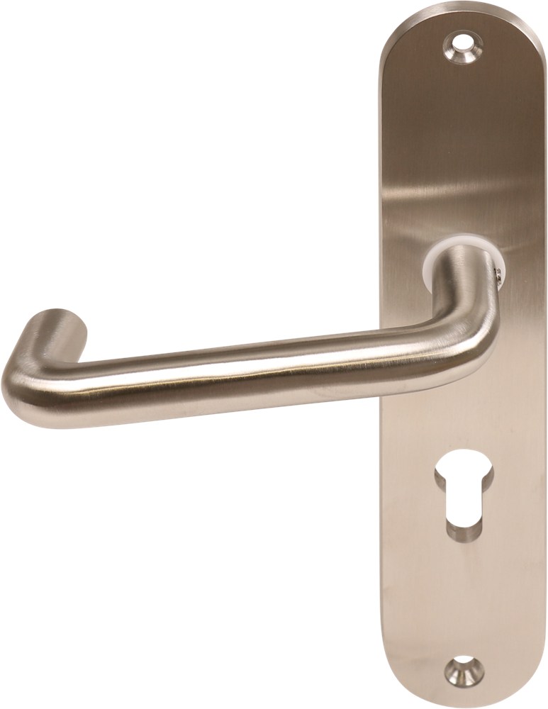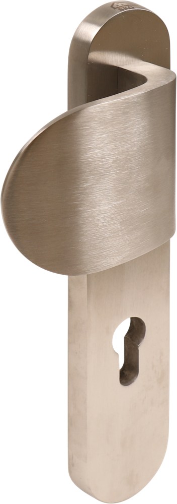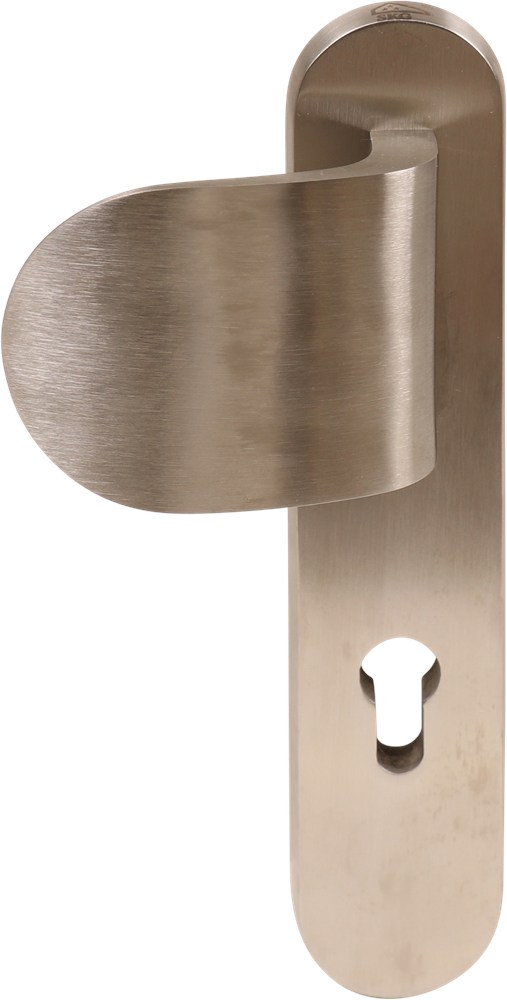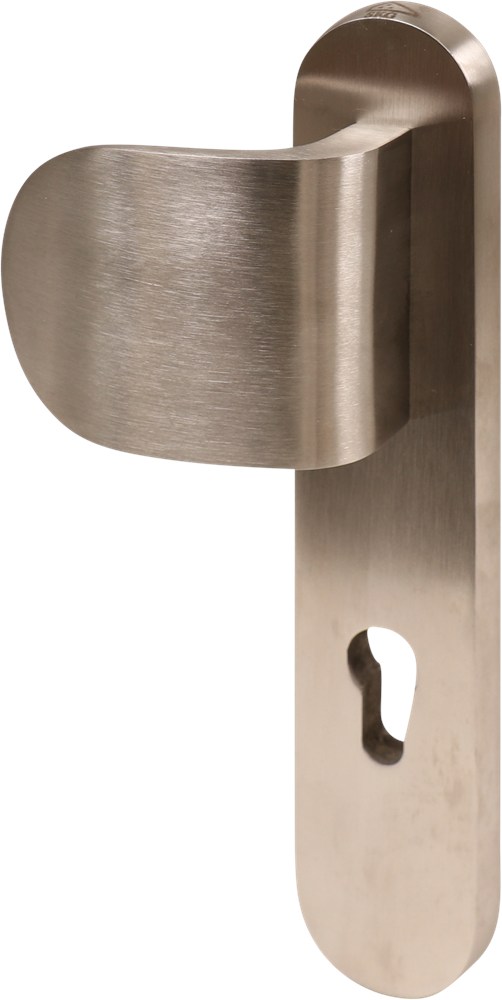 Ovaal model, rvs AISI 316 (A4). Afmeting schild 250x50 mm. Dikte buitenschild is 12 mm en dikte binnenschild is 8 mm. Met blinde bevestiging van binnenuit d.m.v. drie rvs metaalschroeven M6x53 mm. Met deurduwer 90x80 mm en kruk, omkeerbaar. Voor profielcilinder.