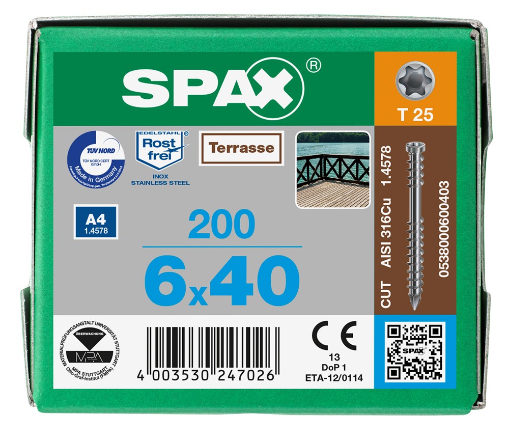 SPAX TERRASSCHROEF CILINDERKOP T-STAR PLUS TX25 DEELDRAAD RVS A4 6,0X40MM 200ST