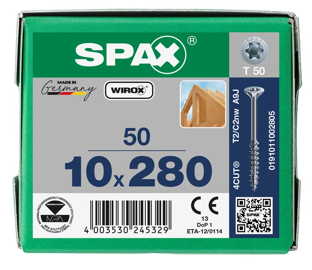 SPAX HOUTSCHROEF VERZONKEN KOP T-STAR PLUS TX50 DEELDRAAD WIROX 10,0X280MM 50ST
