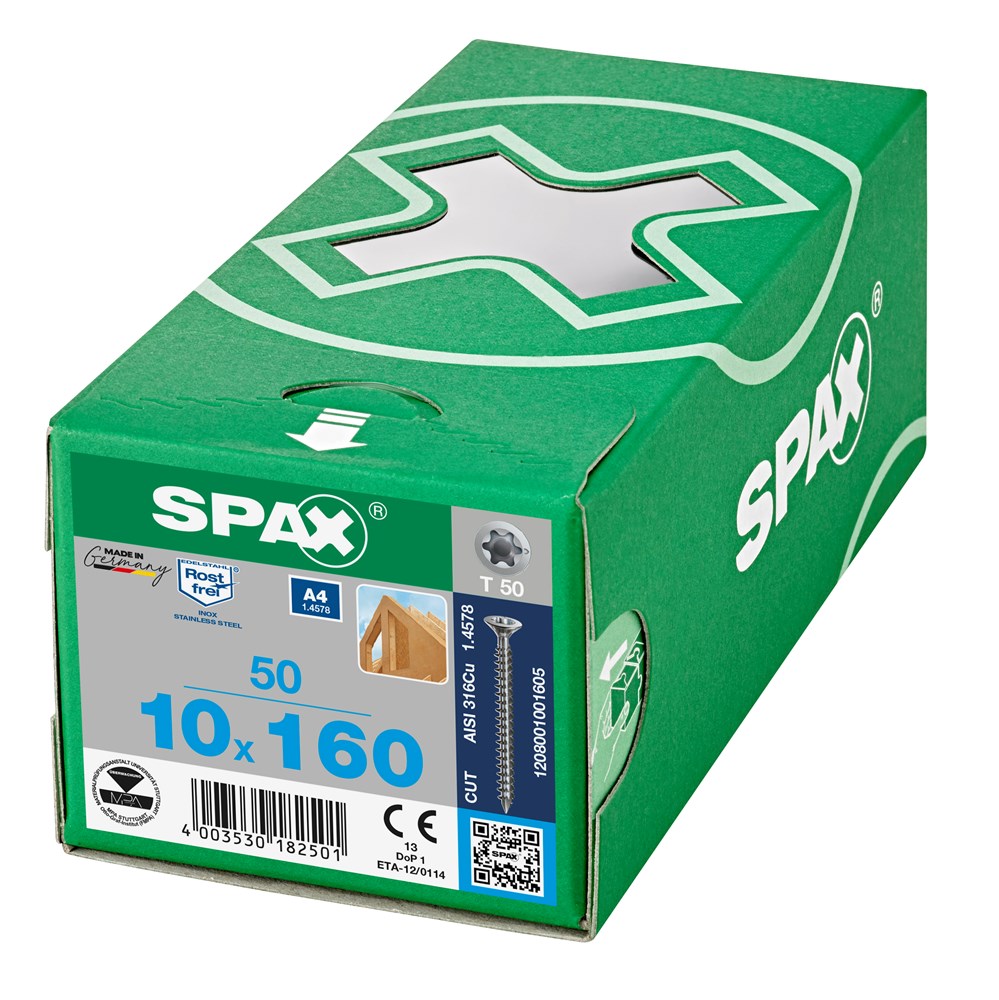 SPAX HOUTSCHROEF VERZONKEN KOP T-STAR PLUS TX50 VOLDRAAD RVS A4 10,0X160MM 50ST