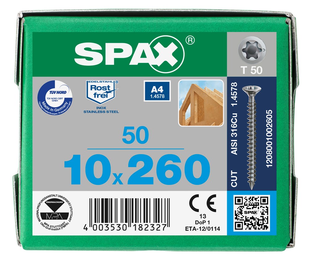 SPAX HOUTSCHROEF VERZONKEN KOP T-STAR PLUS TX50 VOLDRAAD RVS A4 10,0X260MM 50ST