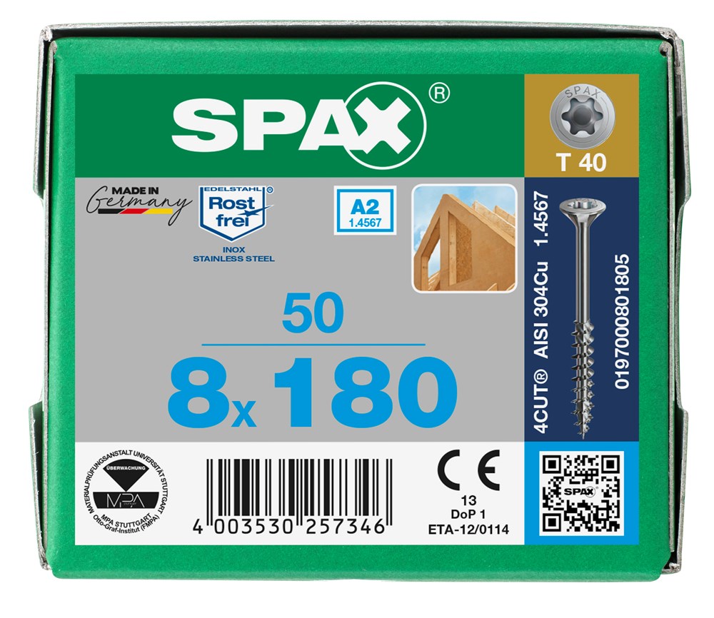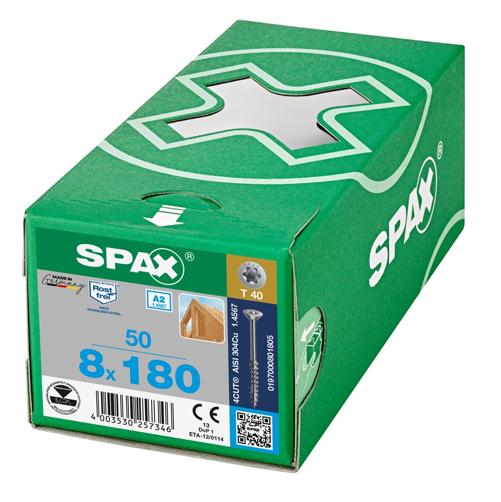 SPAX HOUTSCHROEF VERZONKEN KOP T-STAR PLUS TX40 DEELDRAAD RVS A2 8,0X180MM 50ST
