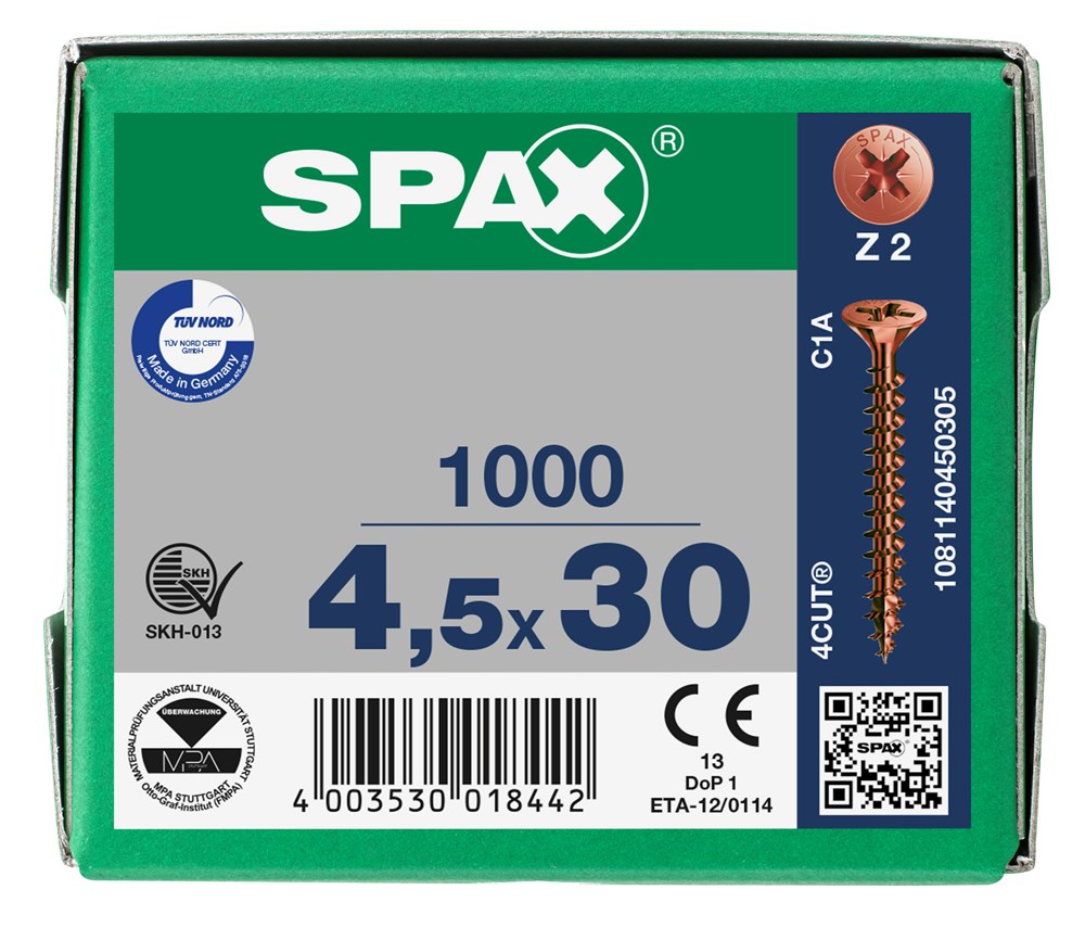 SPAX HOUTSCHROEF VERZONKEN KOP POZIDRIVE PZ2 VOLDRAAD BRUIN 4,5X30MM 1000ST
