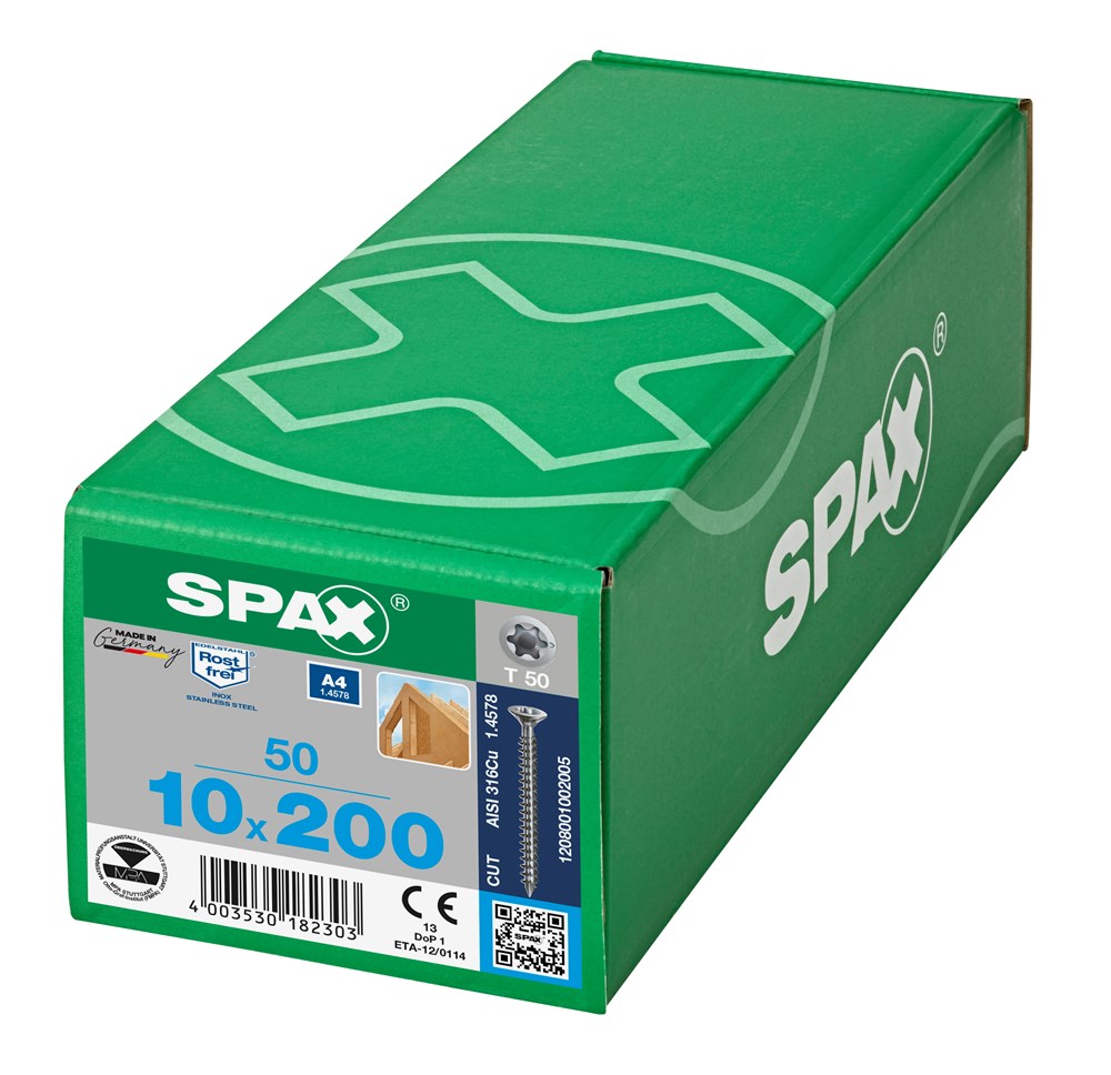 SPAX HOUTSCHROEF VERZONKEN KOP T-STAR PLUS TX50 VOLDRAAD RVS A4 10,0X200MM 50ST