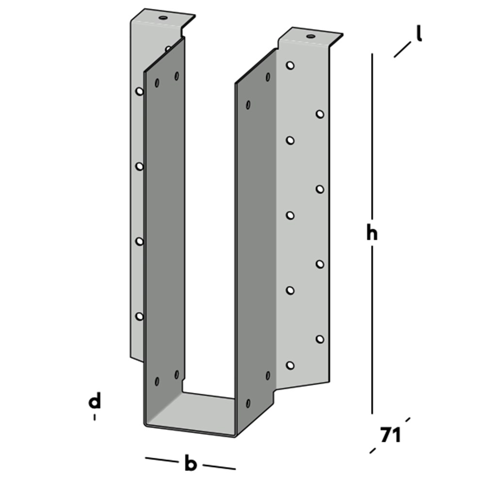 Balkdrager met zijflenzen, voor het bevestigen van dwarsbalken tegen een muur of tegen een andere houten balk. Wordt voornamelijk gebruikt voor houten I-liggers. Leverbaar voor de gangbare kopmaten I-liggers.