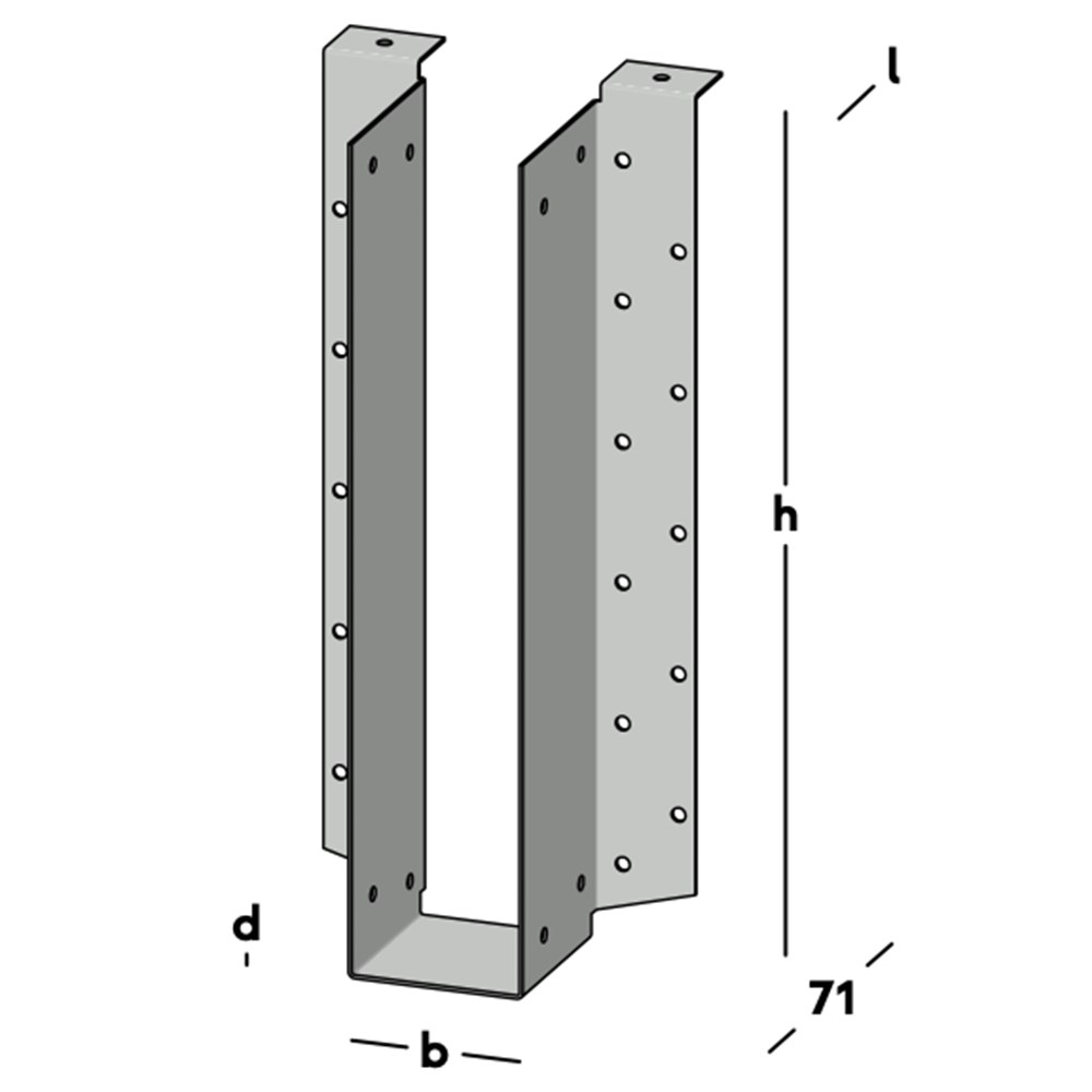 Balkdrager met zijflenzen, voor het bevestigen van dwarsbalken tegen een muur of tegen een andere houten balk. Wordt voornamelijk gebruikt voor houten I-liggers. Leverbaar voor de gangbare kopmaten I-liggers.