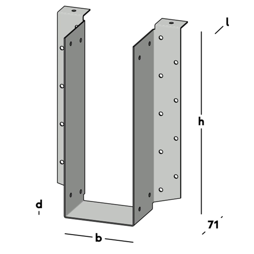Balkdrager met zijflenzen, voor het bevestigen van dwarsbalken tegen een muur of tegen een andere houten balk. Wordt voornamelijk gebruikt voor houten I-liggers. Leverbaar voor de gangbare kopmaten I-liggers.