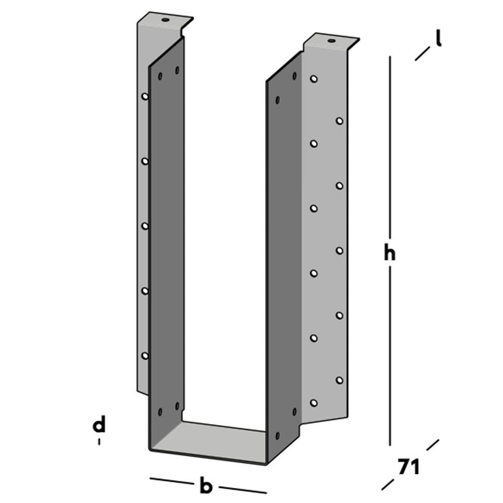 Balkdrager met zijflenzen, voor het bevestigen van dwarsbalken tegen een muur of tegen een andere houten balk. Wordt voornamelijk gebruikt voor houten I-liggers. Leverbaar voor de gangbare kopmaten I-liggers.