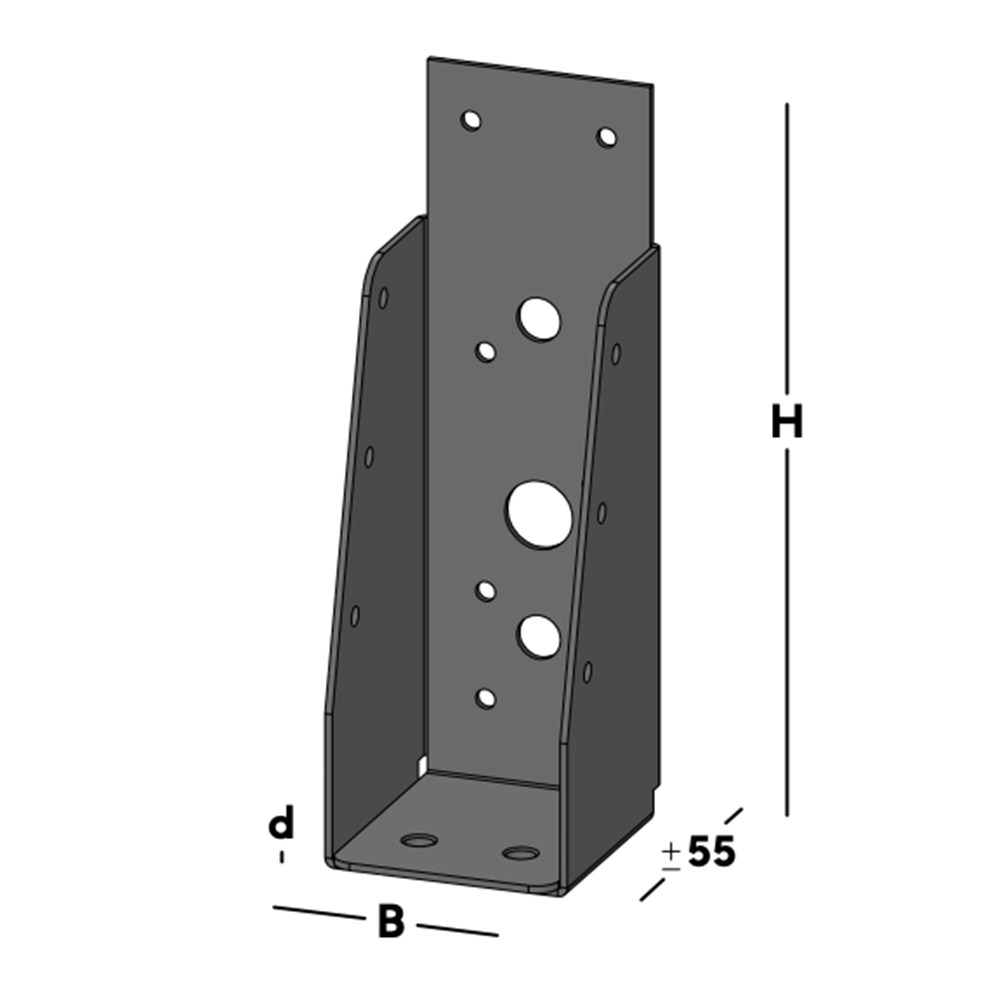Balkdrager voor het verbinden van dwarsbalken rechtstreeks aan een muur. De balkdrager wordt via de gaten in de rug bevestigd. Hierna wordt een balk ingelegd die via de gaten in de zijkant van de balkdrager kan worden gefixeerd.
