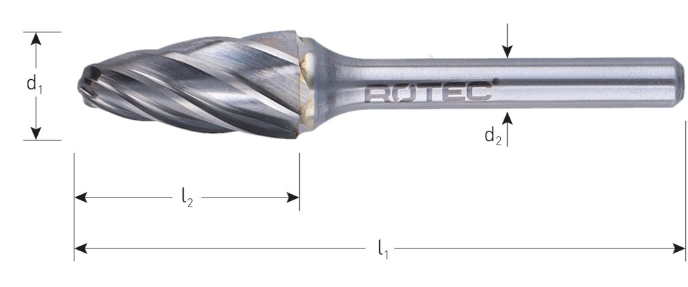 Hardmetalen stiftfrees in boomvorm met ronde kop, in diverse vertandingen.