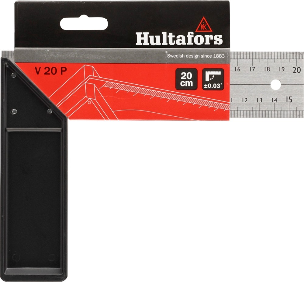 Hultafors winkelhaak V 20 heeft een aluminium blok en millimeterschaalverdeling op de bovenste en onderste rand van het blad.