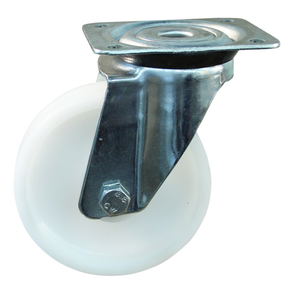 Transportwiel (zwenk) met plaatbevestiging met stalen gaffel, naturel PP (of PA) wiel Serie 34-91