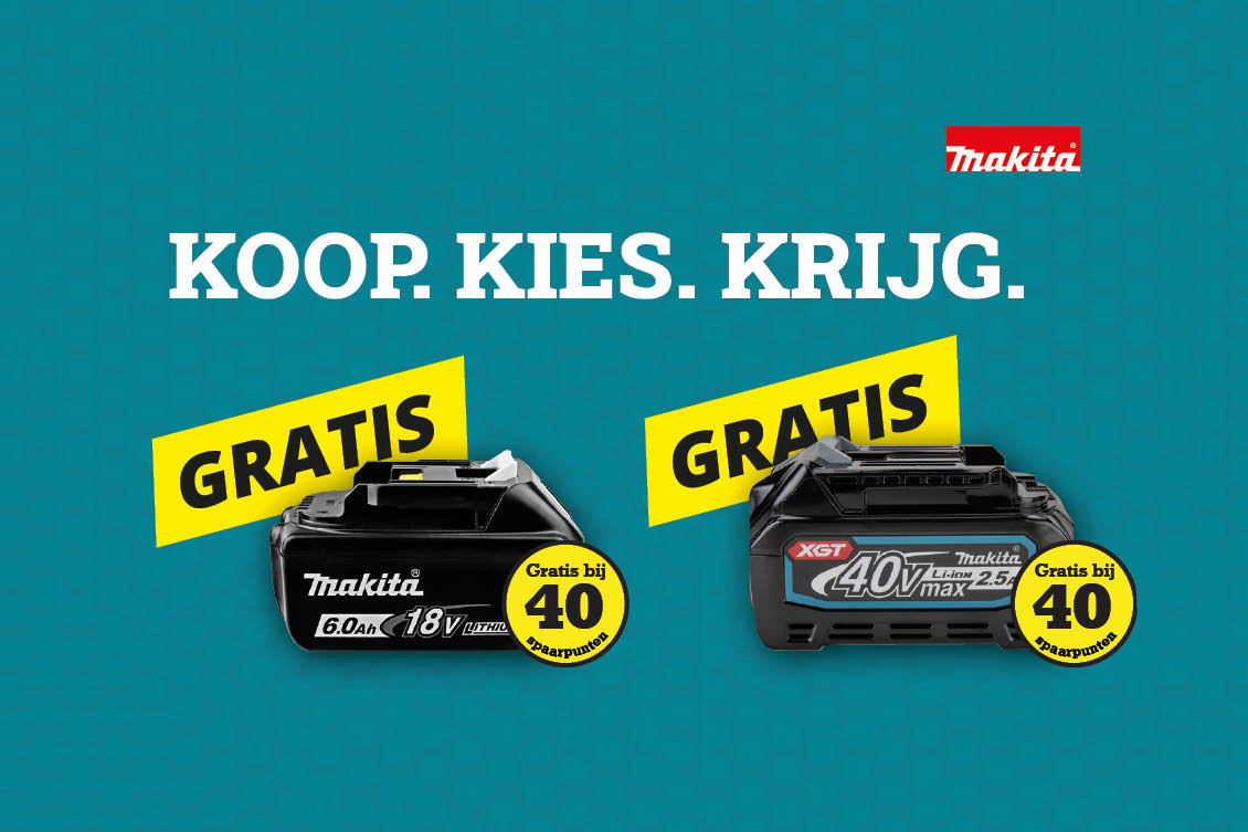 - Ontvang gratis Makita Cadeaupunten en wissel deze in voor een gratis artikel naar keuze uit de cadeauwinkel. Tijdens deze actieperiode zijn er accu’s te kiezen.